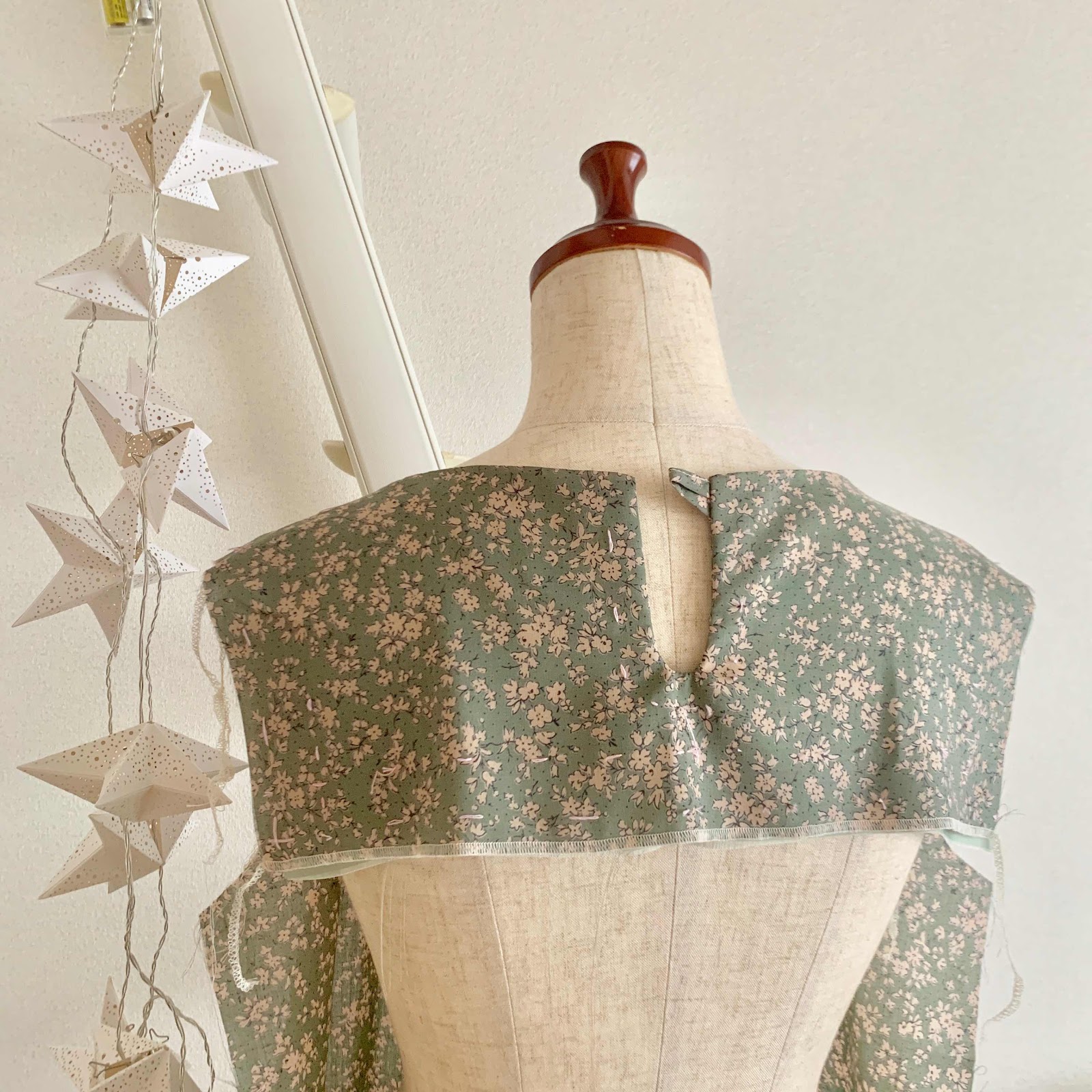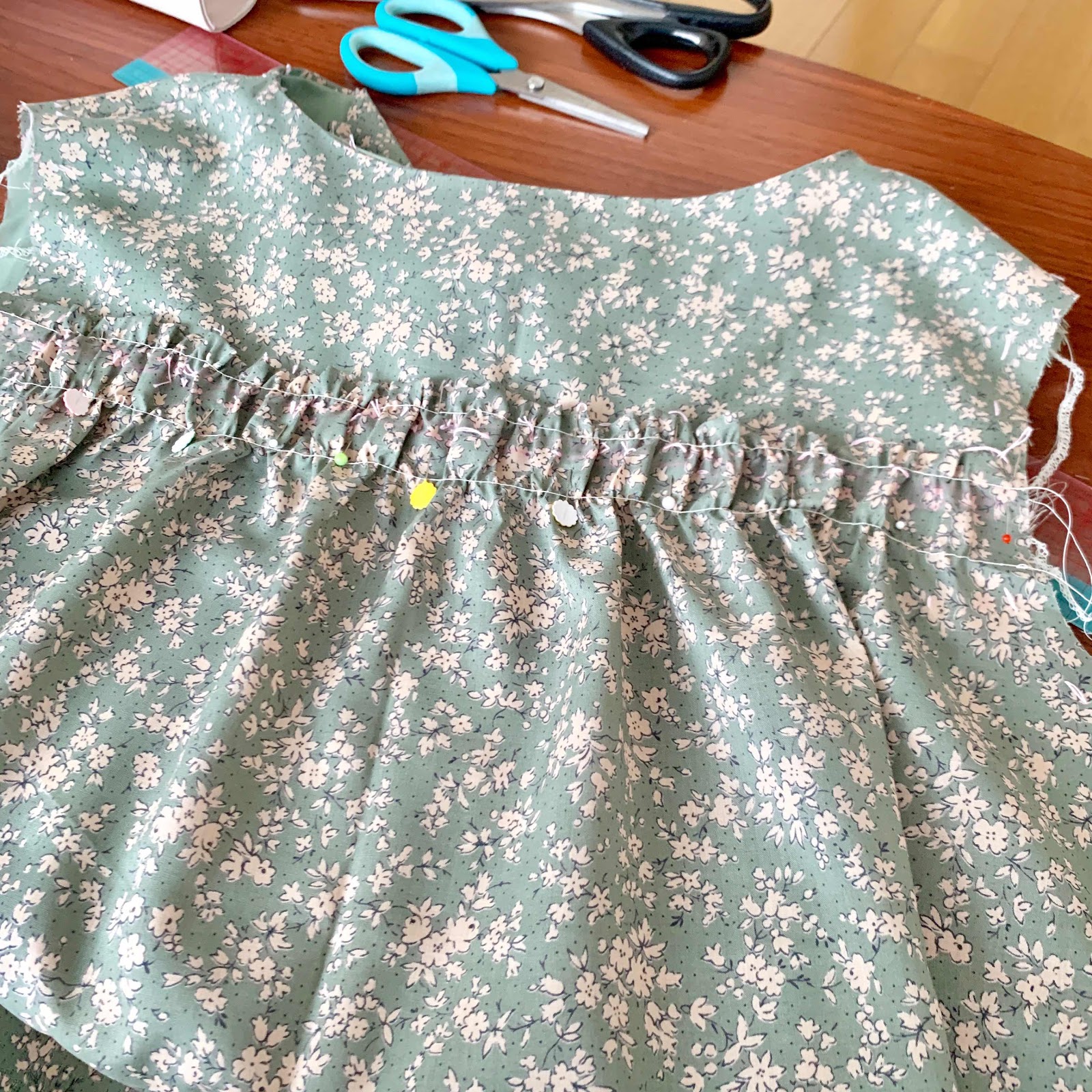 服地のひできさんで購入したセージグリーンの小花柄の生地でフリルワンピースを製作中です。